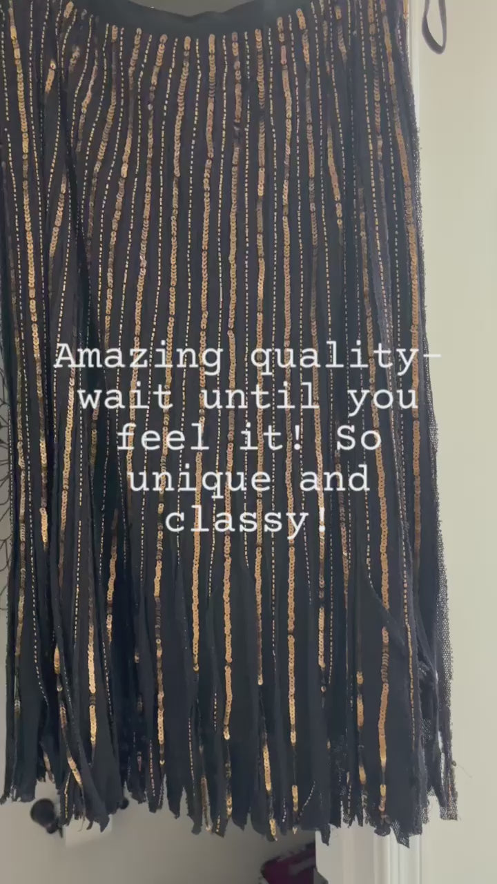 Stylish asymmetrical skirt with bold gold accents. Ideal for special occasions.